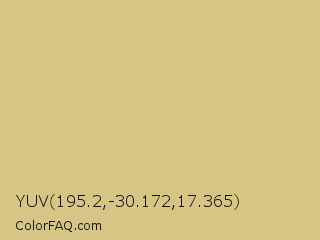 YUV 195.2,-30.172,17.365 Color is a light yellow color and the nearest color is Straw #d4bf8d. Hex code #d7c586 and RGB value is rgb(215,197,134). In RGB color space, this color is composed of 84% red, 77% green, 53% blue, In CMYK color space, this color is composed of 0% cyan, 8% magenta, 38% yellow , 16% black , In HSL color space, this color has a hue angle of 47° , 50% saturation and 68% lightness.