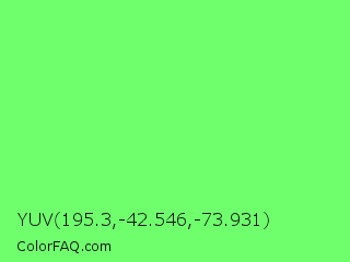 YUV 195.3,-42.546,-73.931 Color is a light green color and the nearest color is Screamin Green #66ff66. Hex code #6fff6d and RGB value is rgb(111,255,109). In RGB color space, this color is composed of 44% red, 100% green, 43% blue, In CMYK color space, this color is composed of 56% cyan, 0% magenta, 57% yellow , 0% black , In HSL color space, this color has a hue angle of 119° , 100% saturation and 71% lightness.