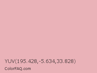 YUV 195.428,-5.634,33.828 Color is a very light red color and the nearest color is Shilo #e8b9b3. Hex code #eab2b8 and RGB value is rgb(234,178,184). In RGB color space, this color is composed of 92% red, 70% green, 72% blue, In CMYK color space, this color is composed of 0% cyan, 24% magenta, 21% yellow , 8% black , In HSL color space, this color has a hue angle of 354° , 57% saturation and 81% lightness.