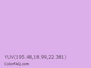 YUV 195.48,18.99,22.381 Color is a light purple color and the nearest color is Medium Lavender Magenta #dda0dd. Hex code #ddafea and RGB value is rgb(221,175,234). In RGB color space, this color is composed of 87% red, 69% green, 92% blue, In CMYK color space, this color is composed of 6% cyan, 25% magenta, 0% yellow , 8% black , In HSL color space, this color has a hue angle of 287° , 58% saturation and 80% lightness.