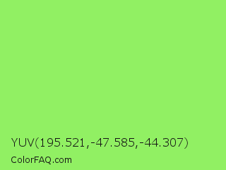 YUV 195.521,-47.585,-44.307 Color is a light green color and the nearest color is Inchworm #b2ec5d. Hex code #91f063 and RGB value is rgb(145,240,99). In RGB color space, this color is composed of 57% red, 94% green, 39% blue, In CMYK color space, this color is composed of 40% cyan, 0% magenta, 59% yellow , 6% black , In HSL color space, this color has a hue angle of 100° , 82% saturation and 66% lightness.