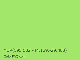 YUV 195.532,-44.139,-29.408 Color is a light green color and the nearest color is Inchworm #b2ec5d. Hex code #a2e66a and RGB value is rgb(162,230,106). In RGB color space, this color is composed of 64% red, 90% green, 42% blue, In CMYK color space, this color is composed of 30% cyan, 0% magenta, 54% yellow , 10% black , In HSL color space, this color has a hue angle of 93° , 71% saturation and 66% lightness.