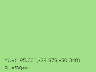 YUV 195.604,-29.878,-30.348 Color is a light green color and the nearest color is Feijoa #9fdd8c. Hex code #a1e187 and RGB value is rgb(161,225,135). In RGB color space, this color is composed of 63% red, 88% green, 53% blue, In CMYK color space, this color is composed of 28% cyan, 0% magenta, 40% yellow , 12% black , In HSL color space, this color has a hue angle of 103° , 60% saturation and 71% lightness.