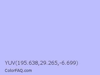 YUV 195.638,29.265,-6.699 Color is a very light blue color and the nearest color is Melrose #c7c1ff. Hex code #bcbcff and RGB value is rgb(188,188,255). In RGB color space, this color is composed of 74% red, 74% green, 100% blue, In CMYK color space, this color is composed of 26% cyan, 26% magenta, 0% yellow , 0% black , In HSL color space, this color has a hue angle of 240° , 100% saturation and 87% lightness.