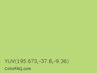 YUV 195.673,-37.8,-9.36 Color is a light lime color and the nearest color is Yellow Green #c5e17a. Hex code #b9d877 and RGB value is rgb(185,216,119). In RGB color space, this color is composed of 73% red, 85% green, 47% blue, In CMYK color space, this color is composed of 14% cyan, 0% magenta, 45% yellow , 15% black , In HSL color space, this color has a hue angle of 79° , 55% saturation and 66% lightness.