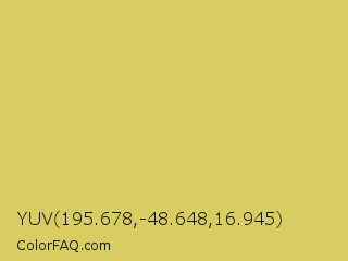 YUV 195.678,-48.648,16.945 Color is a light yellow color and the nearest color is Tacha #d6c562. Hex code #d7cd61 and RGB value is rgb(215,205,97). In RGB color space, this color is composed of 84% red, 80% green, 38% blue, In CMYK color space, this color is composed of 0% cyan, 5% magenta, 55% yellow , 16% black , In HSL color space, this color has a hue angle of 55° , 60% saturation and 61% lightness.
