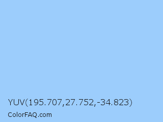 YUV 195.707,27.752,-34.823 Color is a light blue color and the nearest color is Baby Blue Eyes #a1caf1. Hex code #9ccdfc and RGB value is rgb(156,205,252). In RGB color space, this color is composed of 61% red, 80% green, 99% blue, In CMYK color space, this color is composed of 38% cyan, 19% magenta, 0% yellow , 1% black , In HSL color space, this color has a hue angle of 209° , 94% saturation and 80% lightness.