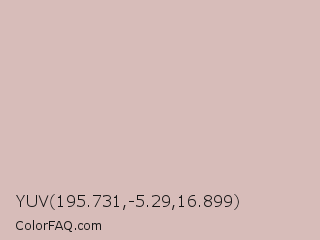 YUV 195.731,-5.29,16.899 Color is a light red color and the nearest color is Cold Turkey #cebaba. Hex code #d7bcb9 and RGB value is rgb(215,188,185). In RGB color space, this color is composed of 84% red, 74% green, 73% blue, In CMYK color space, this color is composed of 0% cyan, 13% magenta, 14% yellow , 16% black , In HSL color space, this color has a hue angle of 6° , 27% saturation and 78% lightness.