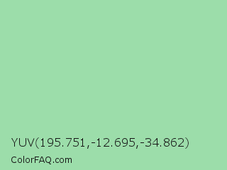 YUV 195.751,-12.695,-34.862 Color is a light green color and the nearest color is Turquoise Green #a0d6b4. Hex code #9cddaa and RGB value is rgb(156,221,170). In RGB color space, this color is composed of 61% red, 87% green, 67% blue, In CMYK color space, this color is composed of 29% cyan, 0% magenta, 23% yellow , 13% black , In HSL color space, this color has a hue angle of 133° , 49% saturation and 74% lightness.