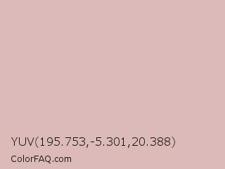 YUV 195.753,-5.301,20.388 Color is a light red color and the nearest color is Blossom #dcb4bc. Hex code #dbbab9 and RGB value is rgb(219,186,185). In RGB color space, this color is composed of 86% red, 73% green, 73% blue, In CMYK color space, this color is composed of 0% cyan, 15% magenta, 16% yellow , 14% black , In HSL color space, this color has a hue angle of 2° , 32% saturation and 79% lightness.