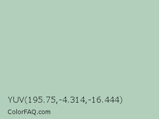 YUV 195.75,-4.314,-16.444 Color is a light green color and the nearest color is Gum Leaf #b6d3bf. Hex code #b1cfbb and RGB value is rgb(177,207,187). In RGB color space, this color is composed of 69% red, 81% green, 73% blue, In CMYK color space, this color is composed of 14% cyan, 0% magenta, 10% yellow , 19% black , In HSL color space, this color has a hue angle of 140° , 24% saturation and 75% lightness.