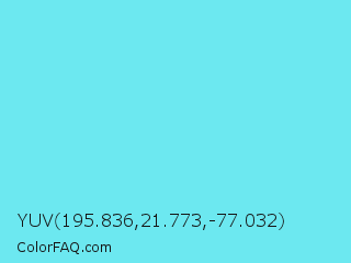 YUV 195.836,21.773,-77.032 Color is a light cyan color and the nearest color is Turquoise Blue #6cdae7. Hex code #6ce8f0 and RGB value is rgb(108,232,240). In RGB color space, this color is composed of 42% red, 91% green, 94% blue, In CMYK color space, this color is composed of 55% cyan, 3% magenta, 0% yellow , 6% black , In HSL color space, this color has a hue angle of 184° , 81% saturation and 68% lightness.