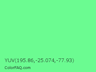 YUV 195.86,-25.074,-77.93 Color is a light green color and the nearest color is Very Light Malachite Green #64e986. Hex code #6bfb91 and RGB value is rgb(107,251,145). In RGB color space, this color is composed of 42% red, 98% green, 57% blue, In CMYK color space, this color is composed of 57% cyan, 0% magenta, 42% yellow , 2% black , In HSL color space, this color has a hue angle of 136° , 95% saturation and 70% lightness.