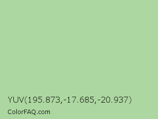 YUV 195.873,-17.685,-20.937 Color is a light green color and the nearest color is Granny Smith Apple #a8e4a0. Hex code #acd7a0 and RGB value is rgb(172,215,160). In RGB color space, this color is composed of 67% red, 84% green, 63% blue, In CMYK color space, this color is composed of 20% cyan, 0% magenta, 26% yellow , 16% black , In HSL color space, this color has a hue angle of 107° , 41% saturation and 74% lightness.