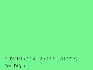 YUV 195.904,-25.096,-70.953 Color is a light green color and the nearest color is Very Light Malachite Green #64e986. Hex code #73f791 and RGB value is rgb(115,247,145). In RGB color space, this color is composed of 45% red, 97% green, 57% blue, In CMYK color space, this color is composed of 53% cyan, 0% magenta, 41% yellow , 3% black , In HSL color space, this color has a hue angle of 134° , 89% saturation and 71% lightness.