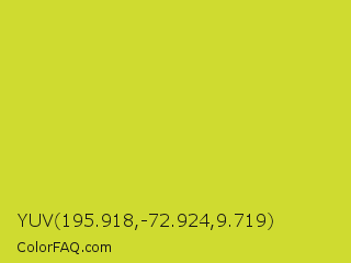 YUV 195.918,-72.924,9.719 Color is a normal yellow color and the nearest color is Pear #d1e231. Hex code #cfdb30 and RGB value is rgb(207,219,48). In RGB color space, this color is composed of 81% red, 86% green, 19% blue, In CMYK color space, this color is composed of 5% cyan, 0% magenta, 78% yellow , 14% black , In HSL color space, this color has a hue angle of 64° , 70% saturation and 52% lightness.