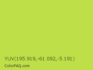 YUV 195.919,-61.092,-5.191 Color is a normal lime color and the nearest color is June Bud #bdda57. Hex code #bedf48 and RGB value is rgb(190,223,72). In RGB color space, this color is composed of 75% red, 87% green, 28% blue, In CMYK color space, this color is composed of 15% cyan, 0% magenta, 68% yellow , 13% black , In HSL color space, this color has a hue angle of 73° , 70% saturation and 58% lightness.