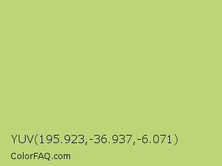 YUV 195.923,-36.937,-6.071 Color is a light lime color and the nearest color is Yellow Green #c5e17a. Hex code #bdd679 and RGB value is rgb(189,214,121). In RGB color space, this color is composed of 74% red, 84% green, 47% blue, In CMYK color space, this color is composed of 12% cyan, 0% magenta, 43% yellow , 16% black , In HSL color space, this color has a hue angle of 76° , 53% saturation and 66% lightness.