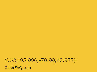 YUV 195.996,-70.99,42.977 Color is a normal yellow color and the nearest color is Saffron #f4c430. Hex code #f5c734 and RGB value is rgb(245,199,52). In RGB color space, this color is composed of 96% red, 78% green, 20% blue, In CMYK color space, this color is composed of 0% cyan, 19% magenta, 79% yellow , 4% black , In HSL color space, this color has a hue angle of 46° , 91% saturation and 58% lightness.