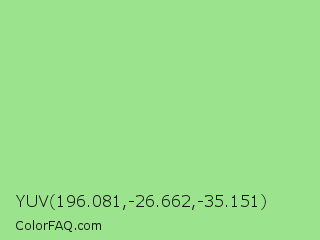 YUV 196.081,-26.662,-35.151 Color is a light green color and the nearest color is Granny Smith Apple Crayola #9de093. Hex code #9ce38e and RGB value is rgb(156,227,142). In RGB color space, this color is composed of 61% red, 89% green, 56% blue, In CMYK color space, this color is composed of 31% cyan, 0% magenta, 37% yellow , 11% black , In HSL color space, this color has a hue angle of 110° , 60% saturation and 72% lightness.