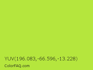 YUV 196.083,-66.596,-13.228 Color is a normal lime color and the nearest color is Conifer #acdd4d. Hex code #b5e63d and RGB value is rgb(181,230,61). In RGB color space, this color is composed of 71% red, 90% green, 24% blue, In CMYK color space, this color is composed of 21% cyan, 0% magenta, 73% yellow , 10% black , In HSL color space, this color has a hue angle of 77° , 77% saturation and 57% lightness.