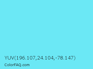 YUV 196.107,24.104,-78.147 Color is a light cyan color and the nearest color is Spray #79deec. Hex code #6be8f5 and RGB value is rgb(107,232,245). In RGB color space, this color is composed of 42% red, 91% green, 96% blue, In CMYK color space, this color is composed of 56% cyan, 5% magenta, 0% yellow , 4% black , In HSL color space, this color has a hue angle of 186° , 87% saturation and 69% lightness.