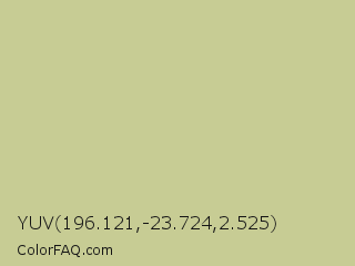 YUV 196.121,-23.724,2.525 Color is a light yellow color and the nearest color is Pine Glade #c7cd90. Hex code #c7cc94 and RGB value is rgb(199,204,148). In RGB color space, this color is composed of 78% red, 80% green, 58% blue, In CMYK color space, this color is composed of 2% cyan, 0% magenta, 27% yellow , 20% black , In HSL color space, this color has a hue angle of 65° , 35% saturation and 69% lightness.
