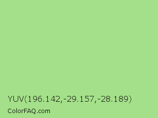 YUV 196.142,-29.157,-28.189 Color is a light green color and the nearest color is Feijoa #9fdd8c. Hex code #a4e089 and RGB value is rgb(164,224,137). In RGB color space, this color is composed of 64% red, 88% green, 54% blue, In CMYK color space, this color is composed of 27% cyan, 0% magenta, 39% yellow , 12% black , In HSL color space, this color has a hue angle of 101° , 58% saturation and 71% lightness.