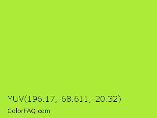 YUV 196.17,-68.611,-20.32 Color is a normal green color and the nearest color is Green Lizard #a7f432. Hex code #adeb39 and RGB value is rgb(173,235,57). In RGB color space, this color is composed of 68% red, 92% green, 22% blue, In CMYK color space, this color is composed of 26% cyan, 0% magenta, 76% yellow , 8% black , In HSL color space, this color has a hue angle of 81° , 82% saturation and 57% lightness.