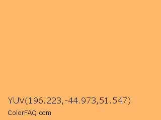 YUV 196.223,-44.973,51.547 Color is a light orange color and the nearest color is Rajah #f7b668. Hex code #ffb869 and RGB value is rgb(255,184,105). In RGB color space, this color is composed of 100% red, 72% green, 41% blue, In CMYK color space, this color is composed of 0% cyan, 28% magenta, 59% yellow , 0% black , In HSL color space, this color has a hue angle of 32° , 100% saturation and 71% lightness.