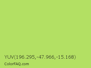 YUV 196.295,-47.966,-15.168 Color is a light green color and the nearest color is Inchworm #b2ec5d. Hex code #b3e063 and RGB value is rgb(179,224,99). In RGB color space, this color is composed of 70% red, 88% green, 39% blue, In CMYK color space, this color is composed of 20% cyan, 0% magenta, 56% yellow , 12% black , In HSL color space, this color has a hue angle of 82° , 67% saturation and 63% lightness.