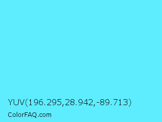 YUV 196.295,28.942,-89.713 Color is a light cyan color and the nearest color is Electric Blue #7df9ff. Hex code #5eedff and RGB value is rgb(94,237,255). In RGB color space, this color is composed of 37% red, 93% green, 100% blue, In CMYK color space, this color is composed of 63% cyan, 7% magenta, 0% yellow , 0% black , In HSL color space, this color has a hue angle of 187° , 100% saturation and 68% lightness.