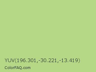 YUV 196.301,-30.221,-13.419 Color is a light green color and the nearest color is Medium Spring Bud #c9dc87. Hex code #b5d887 and RGB value is rgb(181,216,135). In RGB color space, this color is composed of 71% red, 85% green, 53% blue, In CMYK color space, this color is composed of 16% cyan, 0% magenta, 38% yellow , 15% black , In HSL color space, this color has a hue angle of 86° , 51% saturation and 69% lightness.