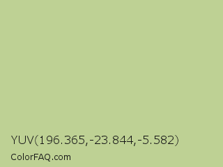 YUV 196.365,-23.844,-5.582 Color is a light lime color and the nearest color is Pine Glade #c7cd90. Hex code #bed194 and RGB value is rgb(190,209,148). In RGB color space, this color is composed of 75% red, 82% green, 58% blue, In CMYK color space, this color is composed of 9% cyan, 0% magenta, 29% yellow , 18% black , In HSL color space, this color has a hue angle of 79° , 40% saturation and 70% lightness.