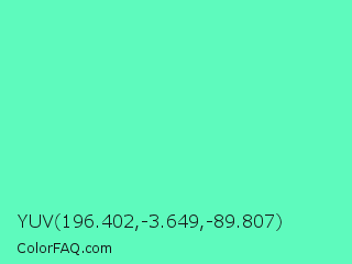 YUV 196.402,-3.649,-89.807 Color is a light green color and the nearest color is Medium Aquamarine #66ddaa. Hex code #5efabd and RGB value is rgb(94,250,189). In RGB color space, this color is composed of 37% red, 98% green, 74% blue, In CMYK color space, this color is composed of 62% cyan, 0% magenta, 24% yellow , 2% black , In HSL color space, this color has a hue angle of 157° , 94% saturation and 67% lightness.