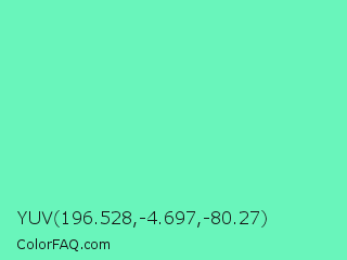 YUV 196.528,-4.697,-80.27 Color is a light green color and the nearest color is Medium Aquamarine #66ddaa. Hex code #69f5bb and RGB value is rgb(105,245,187). In RGB color space, this color is composed of 41% red, 96% green, 73% blue, In CMYK color space, this color is composed of 57% cyan, 0% magenta, 24% yellow , 4% black , In HSL color space, this color has a hue angle of 155° , 88% saturation and 69% lightness.
