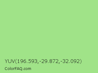 YUV 196.593,-29.872,-32.092 Color is a light green color and the nearest color is Feijoa #9fdd8c. Hex code #a0e388 and RGB value is rgb(160,227,136). In RGB color space, this color is composed of 63% red, 89% green, 53% blue, In CMYK color space, this color is composed of 30% cyan, 0% magenta, 40% yellow , 11% black , In HSL color space, this color has a hue angle of 104° , 62% saturation and 71% lightness.