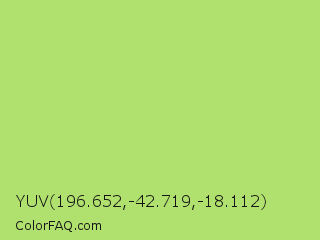 YUV 196.652,-42.719,-18.112 Color is a light green color and the nearest color is Inchworm #b2ec5d. Hex code #b0e06e and RGB value is rgb(176,224,110). In RGB color space, this color is composed of 69% red, 88% green, 43% blue, In CMYK color space, this color is composed of 21% cyan, 0% magenta, 51% yellow , 12% black , In HSL color space, this color has a hue angle of 85° , 65% saturation and 65% lightness.