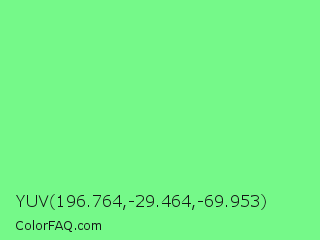 YUV 196.764,-29.464,-69.953 Color is a light green color and the nearest color is Very Light Malachite Green #64e986. Hex code #75f989 and RGB value is rgb(117,249,137). In RGB color space, this color is composed of 46% red, 98% green, 54% blue, In CMYK color space, this color is composed of 53% cyan, 0% magenta, 45% yellow , 2% black , In HSL color space, this color has a hue angle of 129° , 92% saturation and 72% lightness.