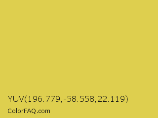 YUV 196.779,-58.558,22.119 Color is a normal yellow color and the nearest color is Wattle #dcd747. Hex code #decf4e and RGB value is rgb(222,207,78). In RGB color space, this color is composed of 87% red, 81% green, 31% blue, In CMYK color space, this color is composed of 0% cyan, 7% magenta, 65% yellow , 13% black , In HSL color space, this color has a hue angle of 54° , 69% saturation and 59% lightness.
