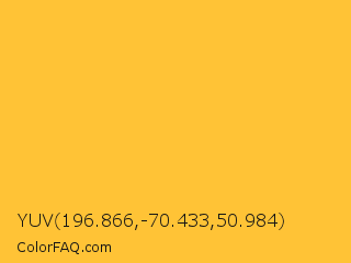 YUV 196.866,-70.433,50.984 Color is a light orange color and the nearest color is Sunglow #ffcc33. Hex code #ffc336 and RGB value is rgb(255,195,54). In RGB color space, this color is composed of 100% red, 76% green, 21% blue, In CMYK color space, this color is composed of 0% cyan, 24% magenta, 79% yellow , 0% black , In HSL color space, this color has a hue angle of 42° , 100% saturation and 61% lightness.