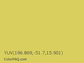 YUV 196.869,-51.7,15.901 Color is a normal yellow color and the nearest color is Tacha #d6c562. Hex code #d7d05c and RGB value is rgb(215,208,92). In RGB color space, this color is composed of 84% red, 82% green, 36% blue, In CMYK color space, this color is composed of 0% cyan, 3% magenta, 57% yellow , 16% black , In HSL color space, this color has a hue angle of 57° , 61% saturation and 60% lightness.