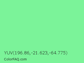 YUV 196.86,-21.623,-64.775 Color is a light green color and the nearest color is Light Green #90ee90. Hex code #7bf399 and RGB value is rgb(123,243,153). In RGB color space, this color is composed of 48% red, 95% green, 60% blue, In CMYK color space, this color is composed of 49% cyan, 0% magenta, 37% yellow , 5% black , In HSL color space, this color has a hue angle of 135° , 83% saturation and 72% lightness.