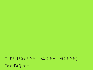 YUV 196.956,-64.068,-30.656 Color is a normal green color and the nearest color is French Lime #9efd38. Hex code #a2f043 and RGB value is rgb(162,240,67). In RGB color space, this color is composed of 64% red, 94% green, 26% blue, In CMYK color space, this color is composed of 33% cyan, 0% magenta, 72% yellow , 6% black , In HSL color space, this color has a hue angle of 87° , 85% saturation and 60% lightness.