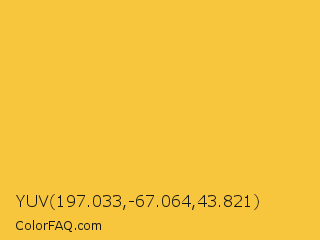 YUV 197.033,-67.064,43.821 Color is a normal orange color and the nearest color is Saffron #f4c430. Hex code #f7c63d and RGB value is rgb(247,198,61). In RGB color space, this color is composed of 97% red, 78% green, 24% blue, In CMYK color space, this color is composed of 0% cyan, 20% magenta, 75% yellow , 3% black , In HSL color space, this color has a hue angle of 44° , 92% saturation and 60% lightness.