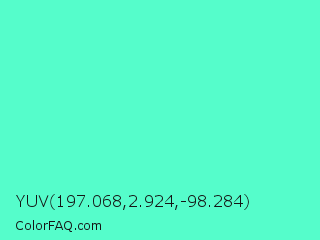 YUV 197.068,2.924,-98.284 Color is a light green color and the nearest color is Turquoise #40e0d0. Hex code #55fdcb and RGB value is rgb(85,253,203). In RGB color space, this color is composed of 33% red, 99% green, 80% blue, In CMYK color space, this color is composed of 66% cyan, 0% magenta, 20% yellow , 1% black , In HSL color space, this color has a hue angle of 162° , 98% saturation and 66% lightness.