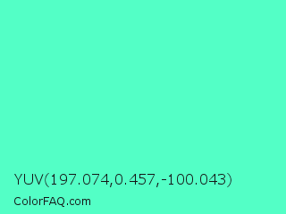 YUV 197.074,0.457,-100.043 Color is a light green color and the nearest color is Turquoise #40e0d0. Hex code #53ffc6 and RGB value is rgb(83,255,198). In RGB color space, this color is composed of 33% red, 100% green, 78% blue, In CMYK color space, this color is composed of 67% cyan, 0% magenta, 22% yellow , 0% black , In HSL color space, this color has a hue angle of 160° , 100% saturation and 66% lightness.