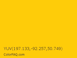 YUV 197.133,-92.257,50.749 Color is a normal yellow color and the nearest color is Mikado Yellow #ffc40c. Hex code #ffcc0a and RGB value is rgb(255,204,10). In RGB color space, this color is composed of 100% red, 80% green, 4% blue, In CMYK color space, this color is composed of 0% cyan, 20% magenta, 96% yellow , 0% black , In HSL color space, this color has a hue angle of 48° , 100% saturation and 52% lightness.