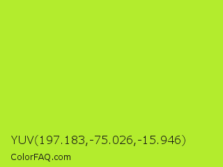 YUV 197.183,-75.026,-15.946 Color is a normal lime color and the nearest color is Green Lizard #a7f432. Hex code #b3ec2d and RGB value is rgb(179,236,45). In RGB color space, this color is composed of 70% red, 93% green, 18% blue, In CMYK color space, this color is composed of 24% cyan, 0% magenta, 81% yellow , 7% black , In HSL color space, this color has a hue angle of 78° , 83% saturation and 55% lightness.