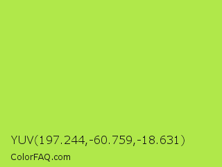 YUV 197.244,-60.759,-18.631 Color is a normal green color and the nearest color is Conifer #acdd4d. Hex code #b0e84a and RGB value is rgb(176,232,74). In RGB color space, this color is composed of 69% red, 91% green, 29% blue, In CMYK color space, this color is composed of 24% cyan, 0% magenta, 68% yellow , 9% black , In HSL color space, this color has a hue angle of 81° , 77% saturation and 60% lightness.